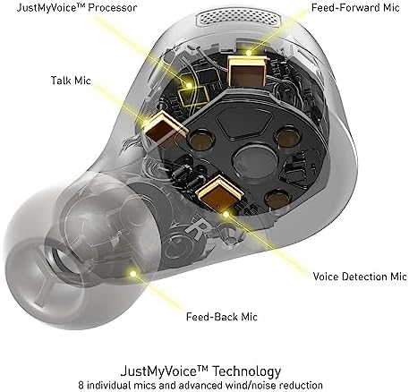 The earbuds also feature Impressive Call Quality Using JustMyVoice Technology, ensuring crystal-clear communication during phone calls. This innovative technology uses your voice to enhance call quality, making every conversation sound as clear as if you were in the same room.